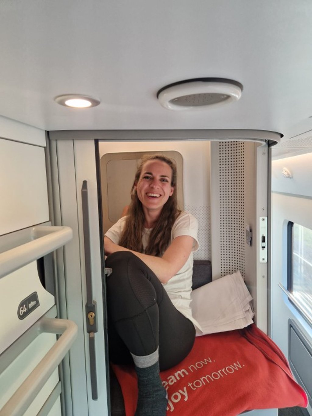 In de vernieuwde Nightjet heb je verschillende reisopties. Je kunt natuurlijk gewoon een stoel boeken, maar wij kozen voor de nieuwste optie: de mini-cabine. Een plek helemaal voor jezelf, waar je kunt liggen. Ja, echt.